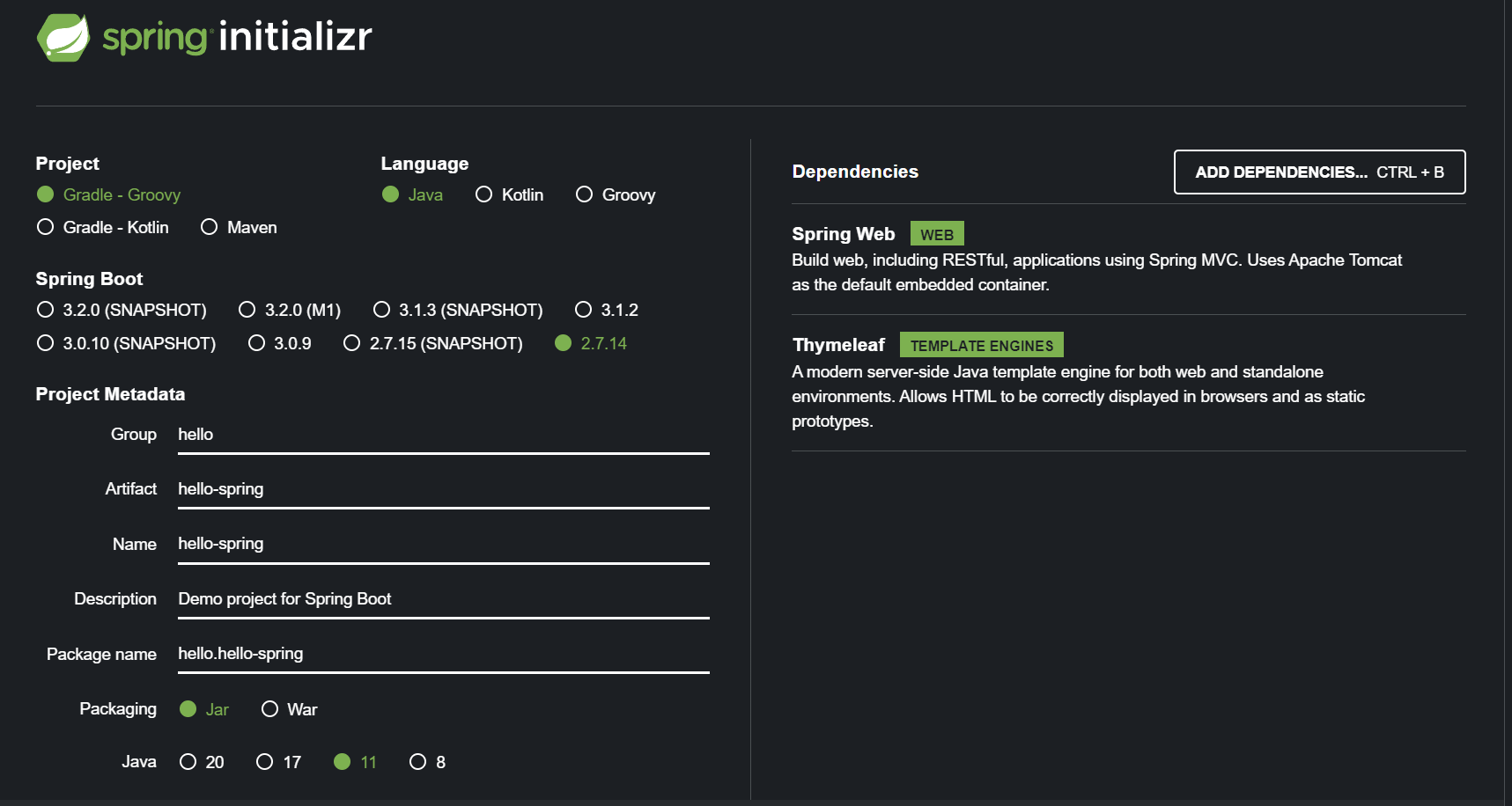 오른쪽 Dependencies(의존성) 부분은, 우린 웹개발을 할 것이니 Spring Web과 Thymeleaf를 추가한다.