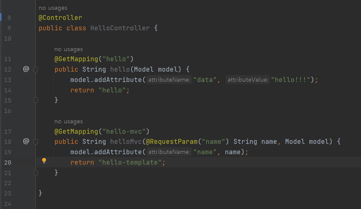 HelloController 파일에 코드를 추가하자. 기존 코드에 아래쪽 helloMvc 메소드 부분을 추가하면 된다.
