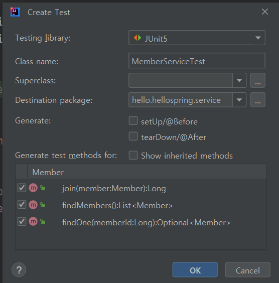 내가 테스트하고 싶은 메소드를 아래에서 체크해서 OK를 누른다.