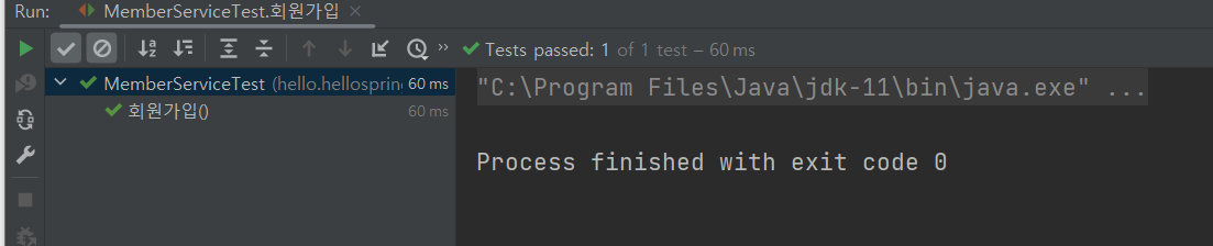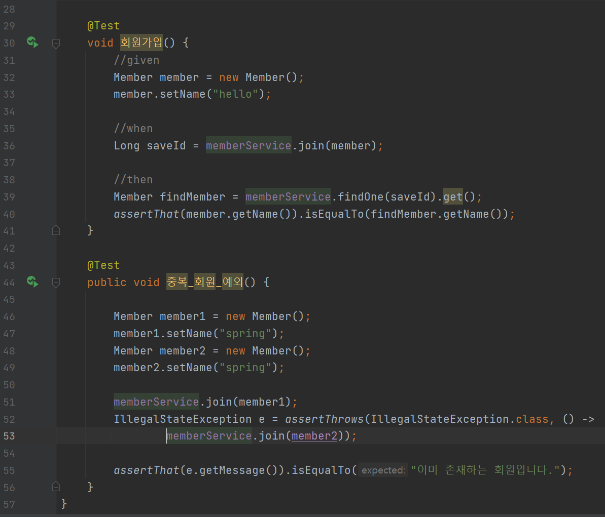 그리고 47행에서 assertThrows 메소드를 이용해, member2를 가입시켰을 경우 예외가 잘 발생하는지 확인한다.