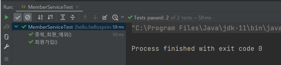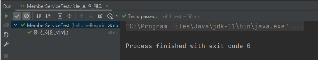그리고 47행에서 assertThrows 메소드를 이용해, member2를 가입시켰을 경우 예외가 잘 발생하는지 확인한다.