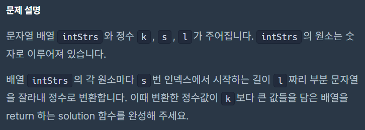반복문을 이용해 intStrs에 담긴 각 요소의 [s : s + l] 부분을 슬라이싱한 값이 k보다 크면 배열에 추가한다.