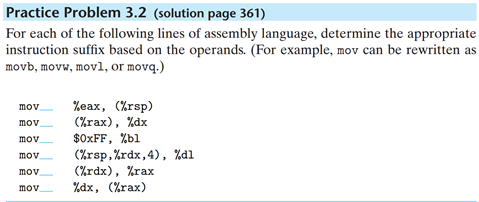 오퍼랜드를 보고 적절한 인스트럭션을 선택하는 문제이다. ex) movl, movq 등등..