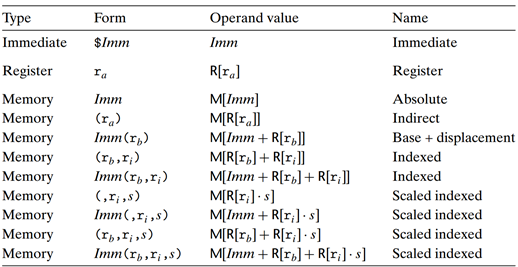 - 메모리 참조를 가능하게 하는 많은 주소지정방식이 존재한다. 가장 일반적인 형태는 표의 마지막에 있는 “Imm(rb, ri, s)” 형태이다.