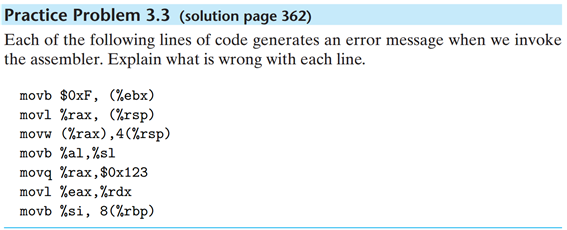 movb $0xF, (%ebx) -> (%ebx) 라는건 불가능하다!! 메모리 주소는 64비트로 이루어져 있는데, %ebx 레지스터는 최대 32비트만 저장할 수 있으므로 메모리 주소를 담을 수 없다. 즉 (%ebx) 자체가 모순이다.
