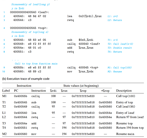 오른쪽 네 개의 열은 레지스터 %rdi / %ras / %rsp / 스택 탑에 담긴 값