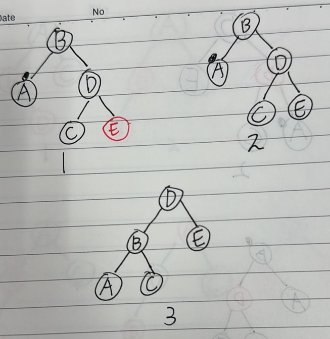 이 때 A도 left 서브트리(D)를 잃게 되는데, D가 놓친 서브트리(E)를 A의 left에 붙여주면 된다.