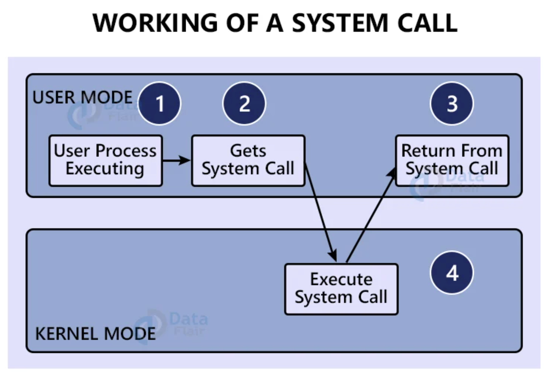 - 프로그램이 파일 시스템, 네트워크 통신, 프로세스 관리 및 IPC 등 커널 모드의 권한이 필요할 경우 System Call을 이용해 커널 모드에 요청하게 된다.