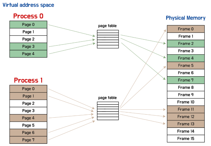 - 가상 메모리와 물리 메모리는 모두 고정된 크기의 블록으로 나뉜다. 가상 메모리 블록을 "페이지" 라고 하고, 물리 메모리 블록을 "페이지 프레임" 이라고 한다.