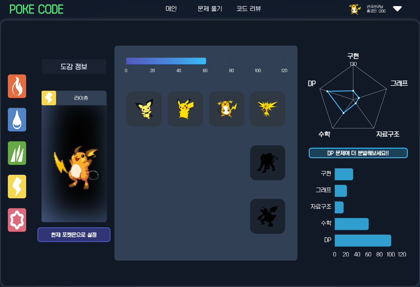 POKE CODE는 알고리즘 문제 제공, 채점 및 메모리 사용량/시간 파악, AI 코드 피드백, 코드 에디터, 공유 에디터, 일반채팅, 음성채팅 등의 기능을 제공합니다.추가적으로 포켓몬 진화 로직과 전설의 포켓몬 시스템을 통해, 알고리즘 학습에 있어서 성취감과 재미요소를 부여합니다.