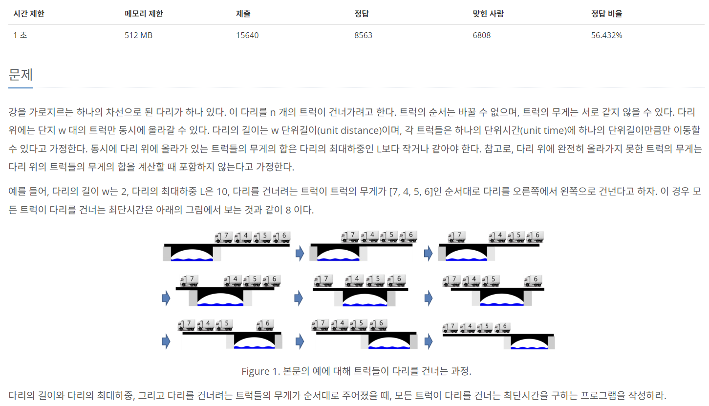 길이와 최대하중이 정해진 다리를 N대의 트럭이 지나가는데에 총 시간이 얼마나 걸리느냐를 구하는 문제이다.