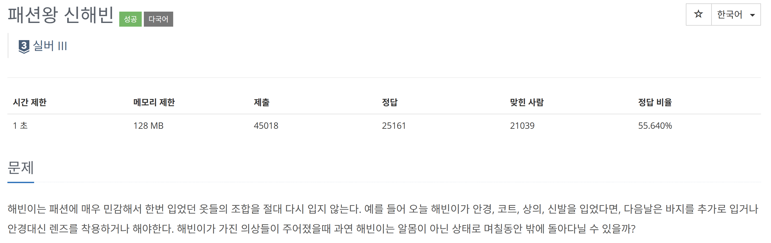 우선, 실버3이다보니 모든 가능한 조합을 브루트포스해도 괜찮겠지 싶어서 생각을 해봤는데, 의상이 30종류라면 2의30승, 약 10억번 연산이 필요해서 이건 아니다 싶었다. 심지어 이 10억번 연산을 최대 100번 할 수도 있다.