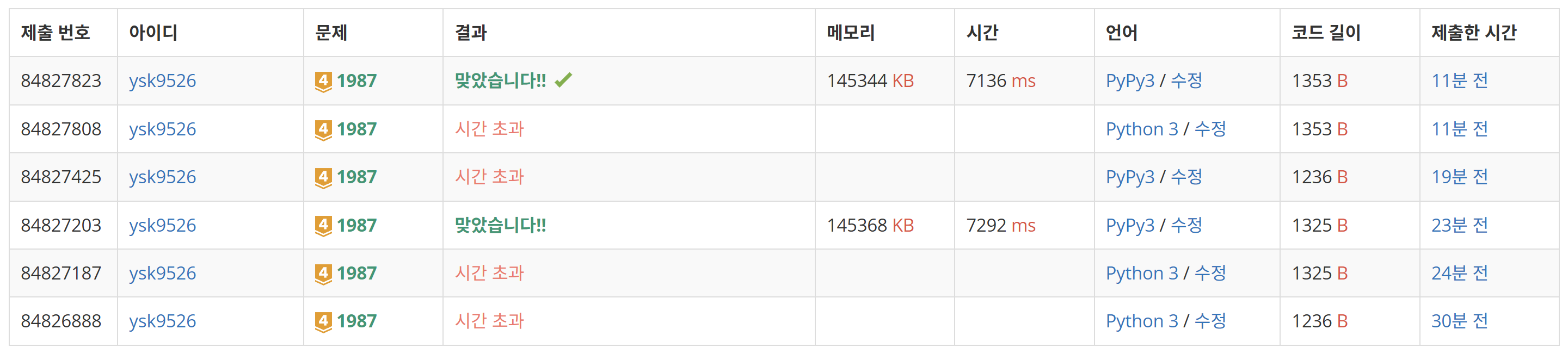 다만 메모리랑 시간을 좀 많이 먹긴 한다. 이 코드는 pypy3으로 제출할 때만 통과되고 python3은 시간 초과가 난다.