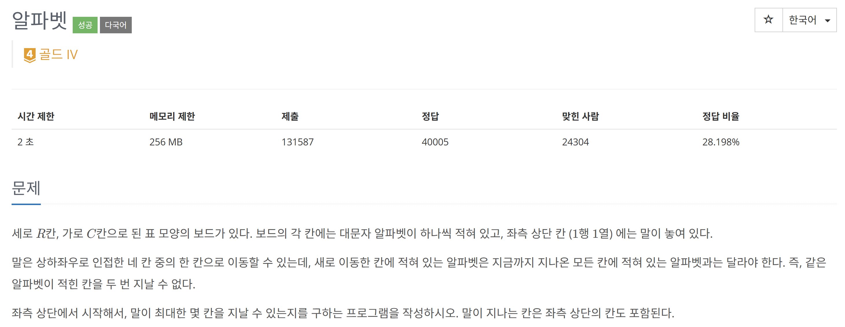 또한 path를 set()이 아닌 일반 리스트로 선언 후 append와 pop으로 구현해도 시간 초과가 난다. 알파벳은 해봤자 26개밖에 안되고, 그러므로 최대 경로 길이는 26이므로 path에 현재경로 알파벳이 있는지 확인하는 not in 연산은 크게 의미 없을거라 생각하는데, set()을 쓰지 않으면 시간 초과라는 것을 고려해 보면 아마 턱걸이로 통과한 코드가 아닐까 싶다.