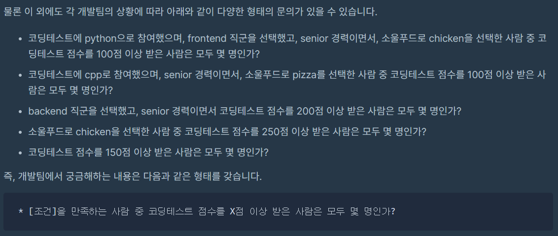 쿼리를 조건과 코테점수로 나누어 리턴합니다.