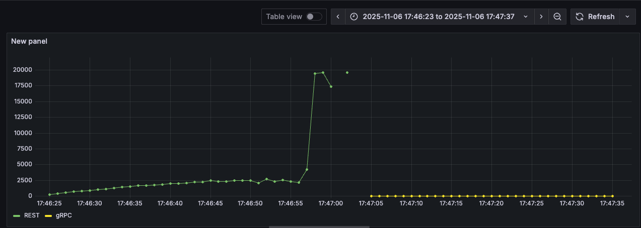초록색 그래프는 REST, 노란색 그래프는 gRPC고 좌측 숫자 단위는 ms이다. REST는 평균적으로 약 2.5s 정도에서 머물다가, 마지막에 20s 정도로 튄 모습이다. 반면 gRPC는 3ms 정도에서 처음부터 끝까지 아주 안정적으로 잘 버티고 있다.