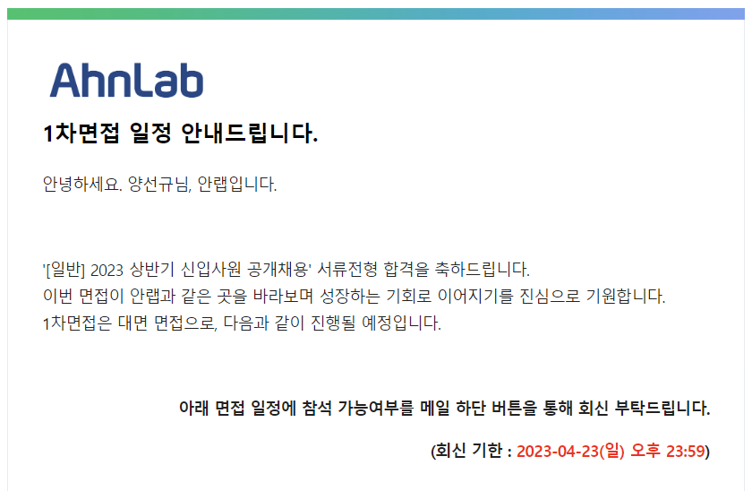 안랩 서류에 합격했다. 기분이 좋다. 솔직히 서류정도는 붙지 않을까? 라고 생각했지만, 무조건 붙는 건 절대로 아니기에 조마조마했었는데 문자와 메일을 통해 합격통지와 1차 면접일정을 받을 수 있었다. 서류마감 이후, 4일만에 결과가 통보되었다. 이정도면 꽤 빠른 것 같다. 메일을 읽는 순간 기분이 너무 좋았다. 1차면접 일정은 5월4일로, 통보를 받은 날짜로부터 정확히 2주 뒤였다. 면접까지 텀이 너무 짧지는 않을까, 준비할 시간이 부족하진 않을까 걱정했었는데 시간이 넉넉해서 다행이라고 느꼈다. 현재는 잡코리아, 구글 등을 참고하여 면접준비를 하고있다. 공통적으로 많이 나오는 질문 위주로 준비할 것이고, 추가적으로 내 이력서와 자소서, 포트폴리오 등을 기준으로 예상질문과 답을 준비하고 있다. 면접은 태어..