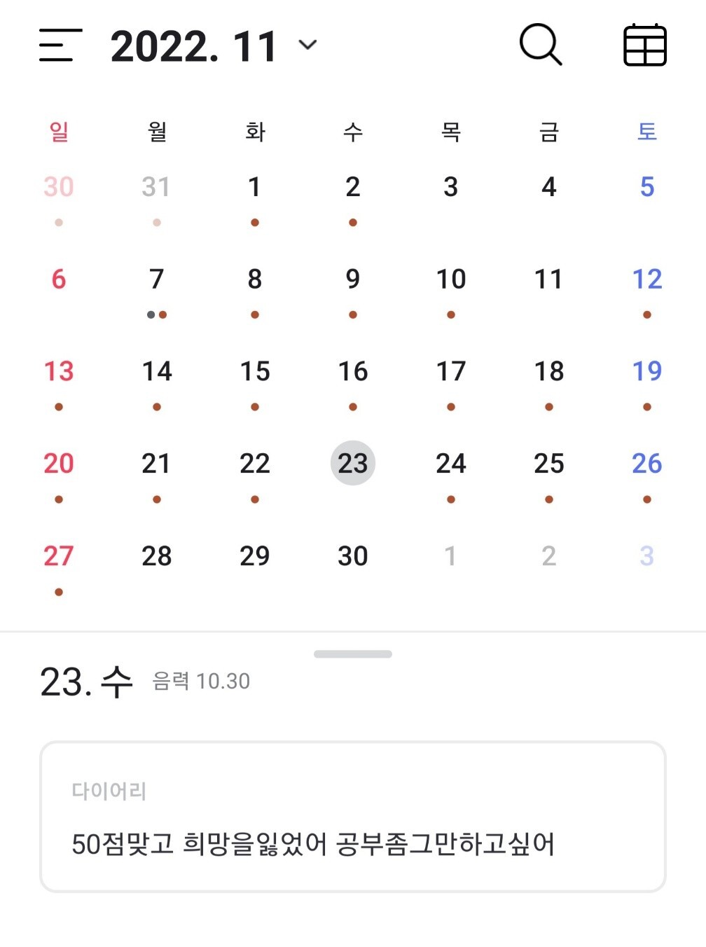 이건 제가 공부하면서 작성한 다이어리(?) 입니다. 할당량을 채운 날에 갈색 점이 있어요.