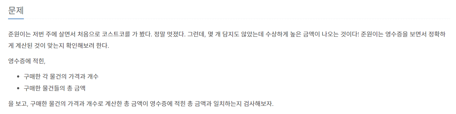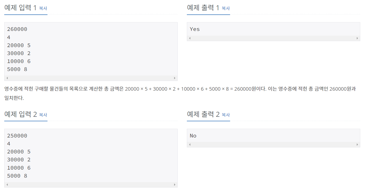 물건 종류별 가격과 갯수를 계산하여, 처음에 입력받은 총액과 일치하는지 검사하는 문제입니다.