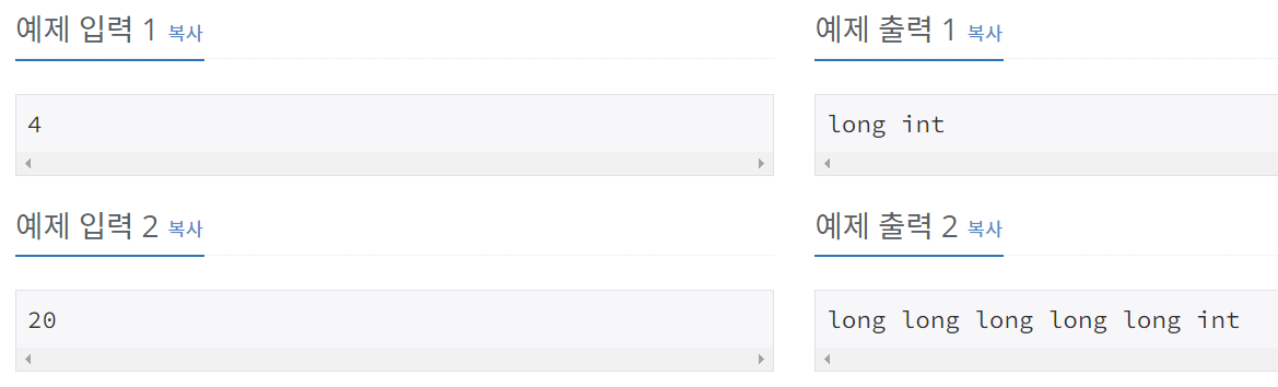 4의 배수만큼 long을 붙이면 되는 문제입니다. 공백도 함께 붙여야 합니다.