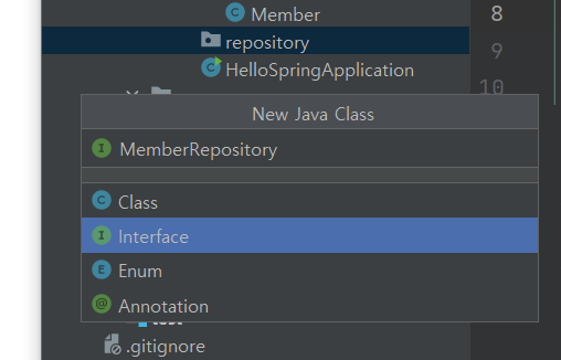 repository 패키지 하위에, MemberRepository "인터페이스"를 만들자.