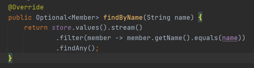 filter 부분은, 입력받은 name과 일치하는 객체만을 스트림에 남기겠다는 뜻이다.