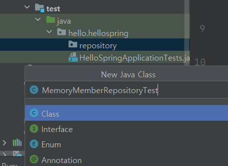 test 디렉터리 밑에서, hello.hellospring.repository 패키지를 만들어 주자.