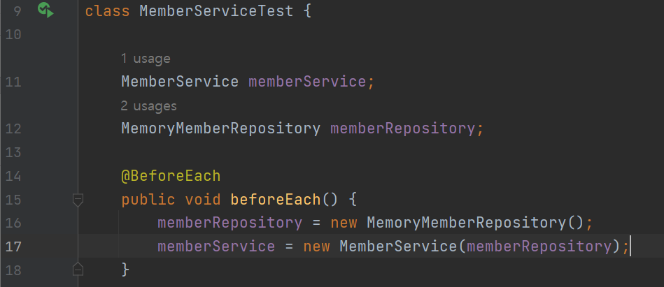 17행에서는 생성한 DB를 그대로 MemberService의 생성자를 통해 주입해준다.