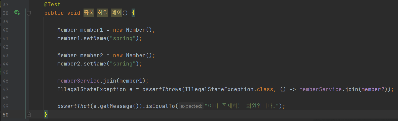 그리고 47행에서 assertThrows 메소드를 이용해, member2를 가입시켰을 경우 예외가 잘 발생하는지 확인한다.