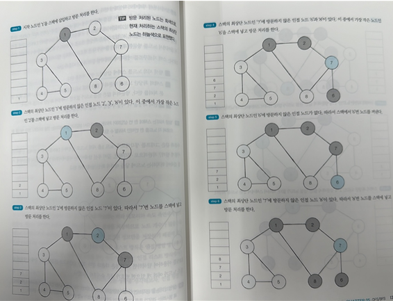 - 스택의 최상단 노드의 방문하지 않은 인접 노드 중, 가장 작은 노드를 스택에 넣고 방문 처리를 반복한다.