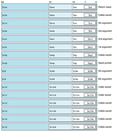 - 기존의 8개의 레지스터가 64비트로 확장 (%rax ~ %rsp)