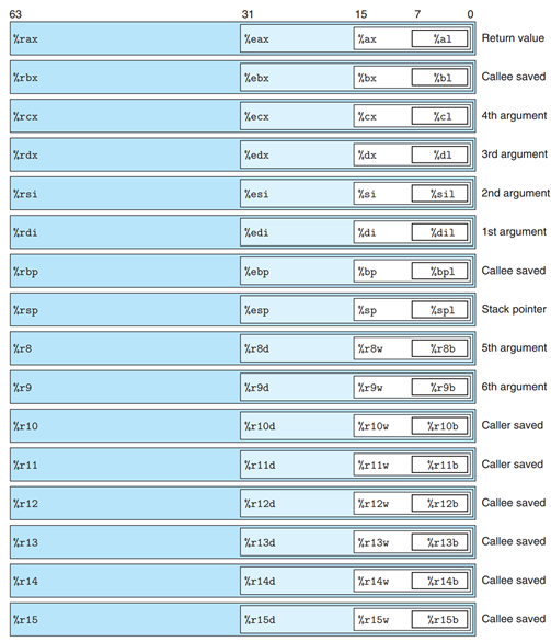 %rbx, %rbp, %r12 ~ %r15 : collee-saved 레지스터, 프로시저를 호출한 후 리턴되어 돌아와도 이 레지스터의 값들은 변하지 않는다.