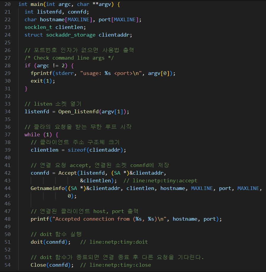 지난 주 webproxy 주차는 나름 나쁘지 않은 성과였지만, 시간이 너무 부족해 web server만 만들고 메인 과제인 proxy서버를 구현하지 못 해서 아쉬움이 남았다. 구현하지 못 한 게 아니라 접근조차 못 했다. proxy 전 과제인 tiny web server 를 끝낸 후 복습하면서 블로그에 정리 글을 올렸더니 이미 수요일이 끝나 있었다. 이틀.. 아니 딱 하루만 더 있었더라도 proxy서버까지 끝낼 수 있었을 텐데. 아쉬움이 남는다. 그나마 위안이 되는 것은 다른 사람들도 나처럼 webproxy 주차가 가장 시간이 부족했다고 말했다는 것이다.