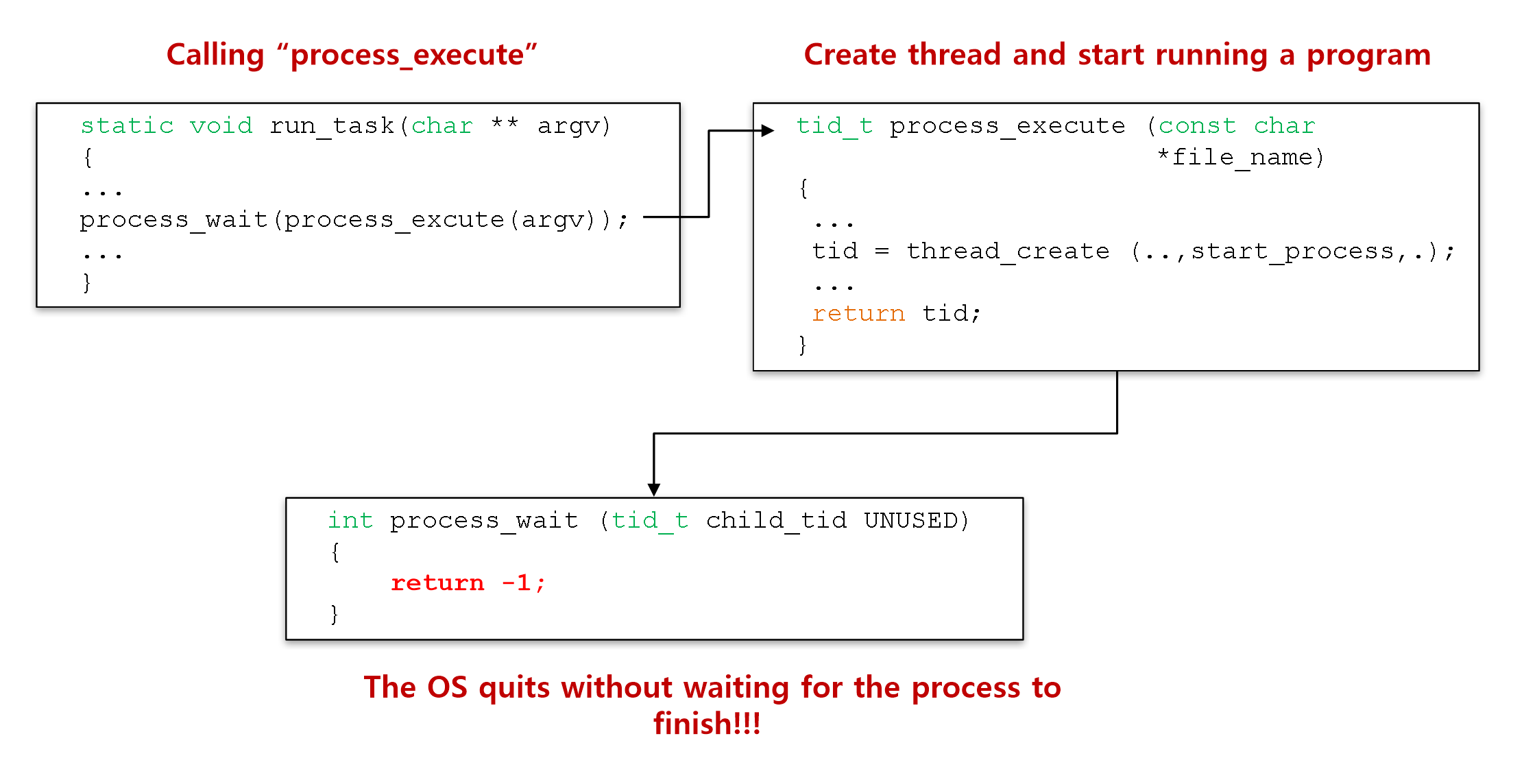 그러나 현재 핀토스는 기다리는 게 구현이 안 되어있다. process_wait에 진입하자마자 바로 return을 때려버린다.