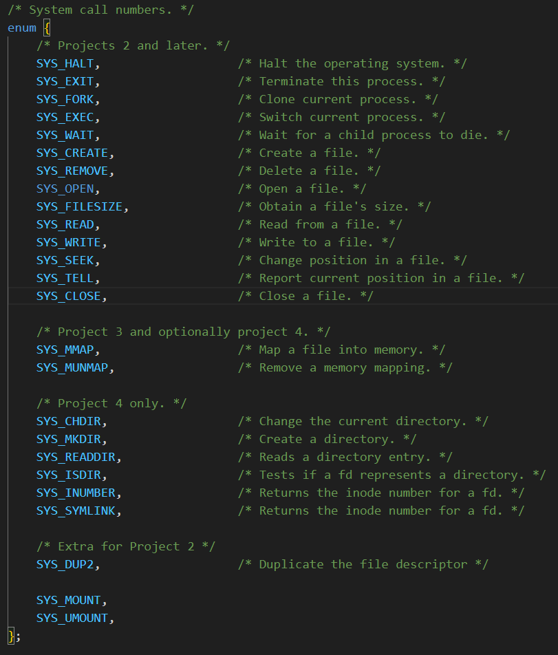 halt부터 0, exit는 1, fork는 2 이런 식으로 증가한다. 이번 project2 에서는 13번 CLOSE까지만 진행하면 된다.