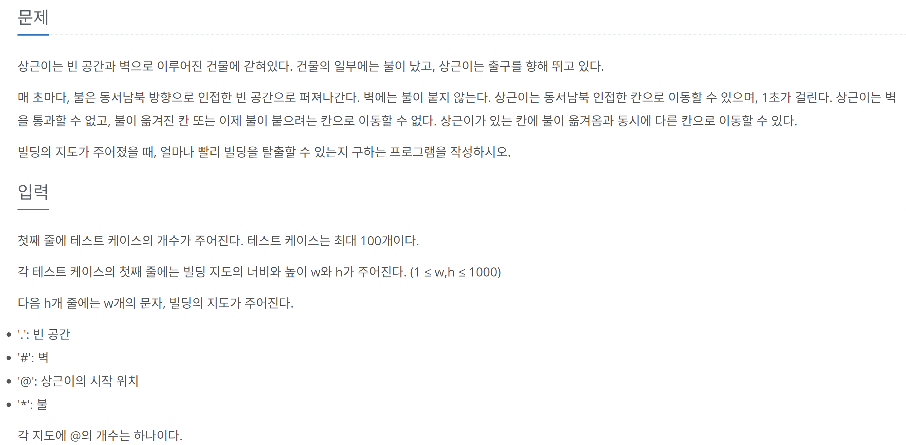 큐를 이용해서 BFS를 하되, while문에 들어가기 전 불의 시작 좌표를 먼저 입력한다. 그러면 이후 while문이 진행될 때 자연스럽게 불 상근이 불 상근이 불 상근이 순서로 불이 먼저 진출하게 된다. 불과 상근이가 겹치면 안 되기 때문에 불을 먼저 진행시키고 상근이가 피해 가는 것이다.