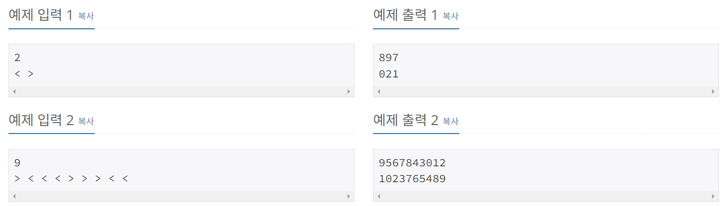 백트래킹 문제이다. 처음엔 부등호 조건을 검사할 때 int로 변환시켜 비교하기 위해서, 맨앞 숫자가 0일경우 0을 빼는 로직을 추가하느라 복잡해졌었다. 하지만 같은 자리수의 숫자끼리는 문자열 상태로 비교해도 int형을 비교하는 것과 완벽하게 같은 효과를 갖는다는 것을 깨닫고 수정했다. min, max 함수에도 적용되는 듯 하다.