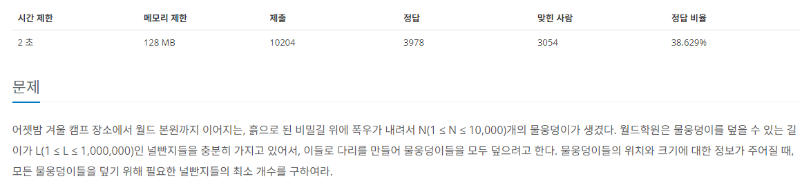 그리디 문제이다. 웅덩이의 위치가 좌표로 제공되며, L 길이의 널빤지를 최소 몇 개를 사용해야 웅덩이를 전부 덮을 수 있는지 계산해야 한다.