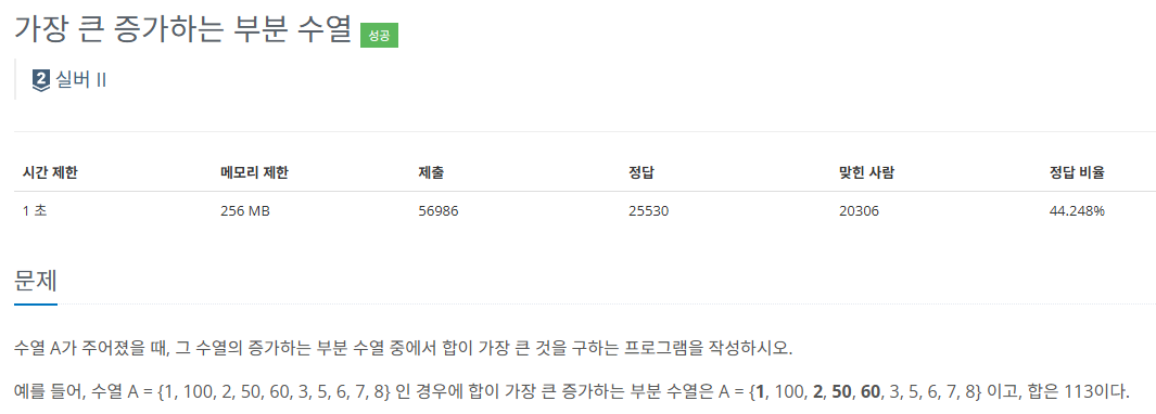 [Baekjoon 11055 / Python / 실버2] 가장 큰 증가하는 부분 수열