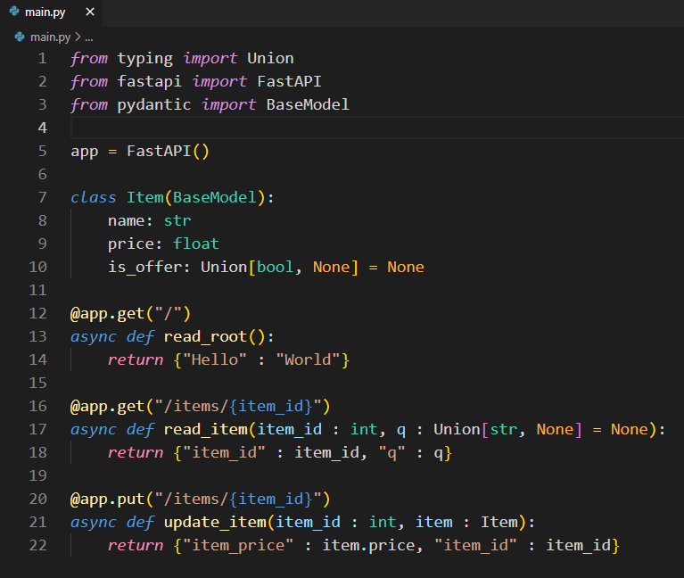 2, 3행 fastapi, pydantic 부분에 노란색 밑줄이 쳐져 있다.