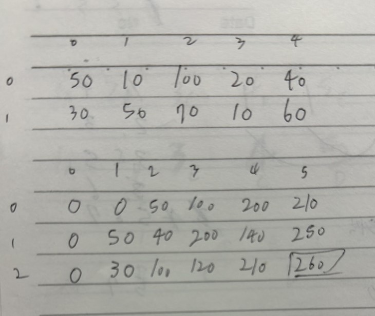 열을 하나 채울 때 마다, 이전 열의 대각선 값 OR 이전 열의 0행 값(전전값중 더 큰 값) 중 더 큰 값과 더해주면 된다.