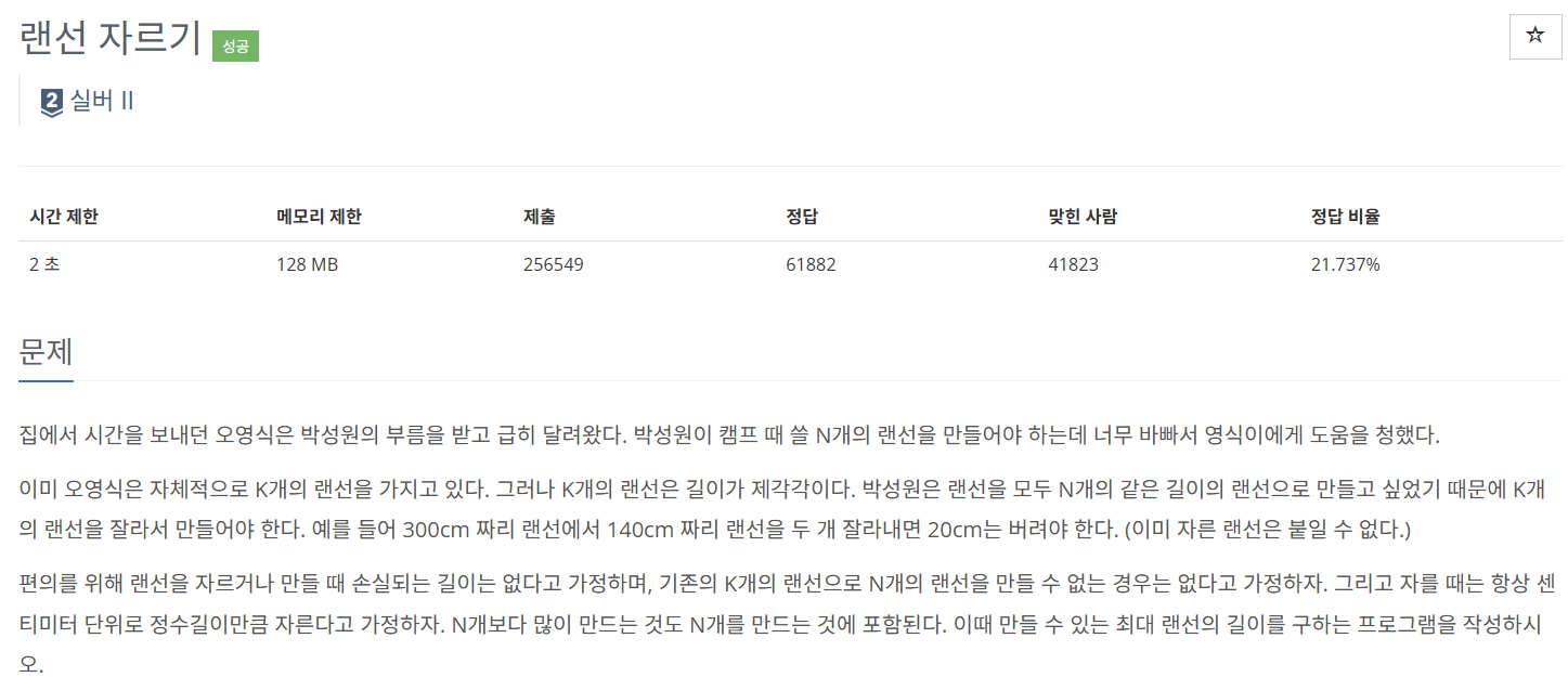 - 랜선 길이를 기준으로 이분 탐색 실시