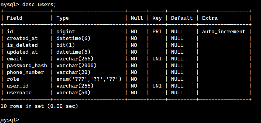 데이터베이스에서 직접 확인해 보면, created_at, updated_at, is_deleted 컬럼이 추가된 것을 확인할 수 있다.