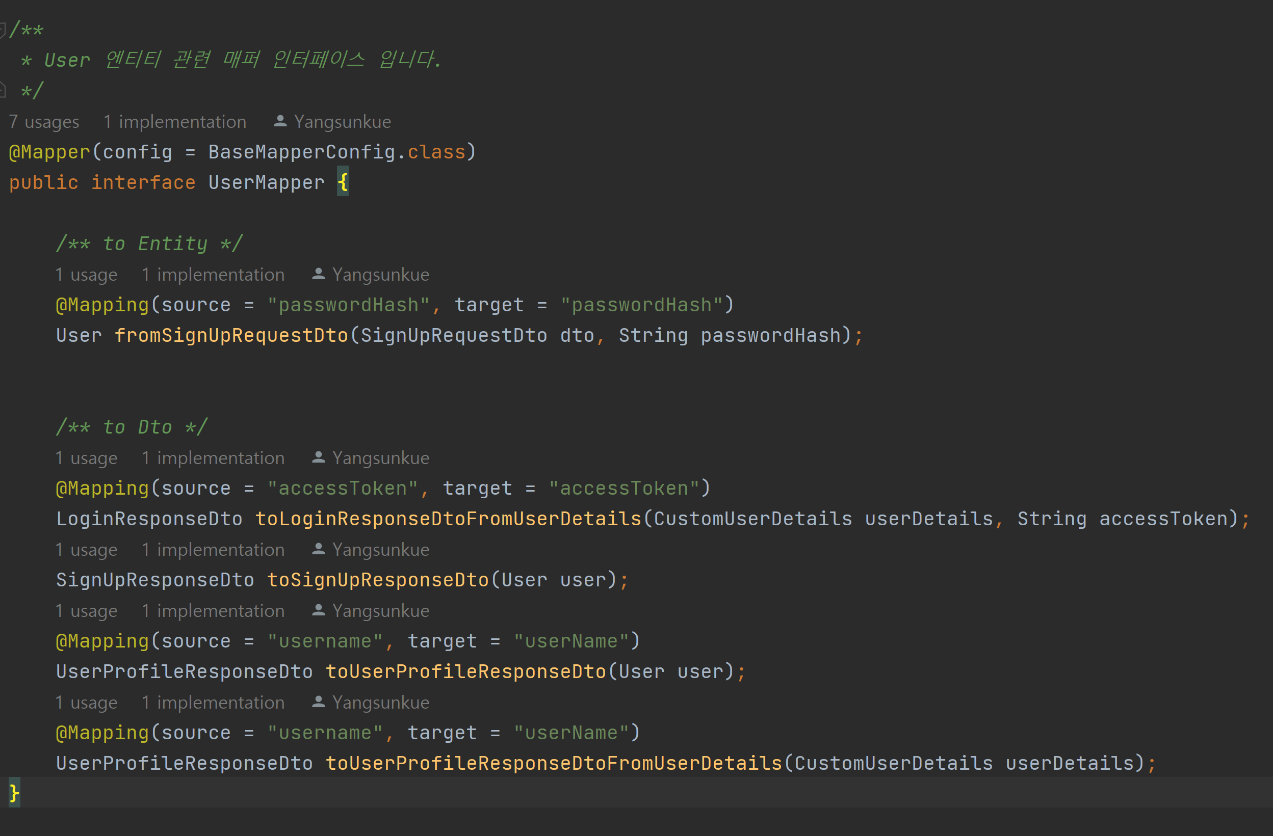 userMapper.fromSignUpRequestDto(dto, hashedPassword) 이런 식으로 매퍼 클래스를 사용한다.