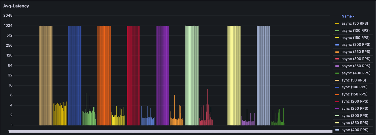 응답시간은 클라이언트가 요청을 보내고 응답을 받기까지의 시간을 의미한다. 왼쪽부터 RPS를 50씩 올려가며, 동기/비동기를 묶어 진행했다.