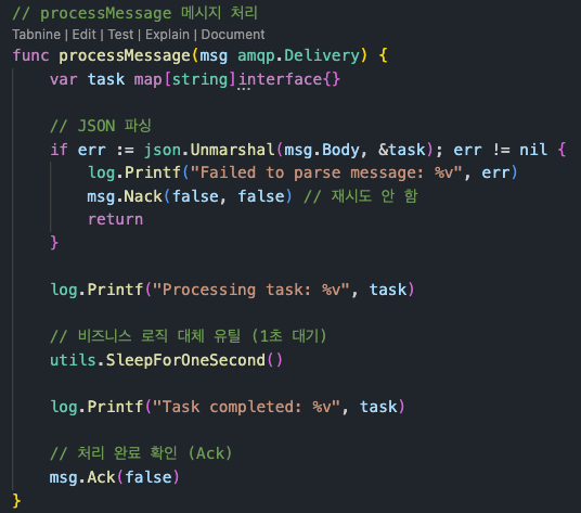 시간을 보면 전부 같은 시간에 처리되어 있는데(11:58:25), Go 서버에서 메시지 큐 태스크를 비동기 + 병렬로 잘 처리하고 있다는 뜻이다.
