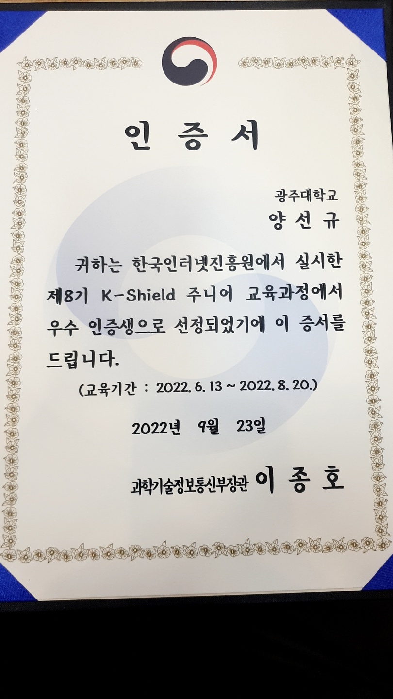 케이쉴드주니어 8기 수료, 과학기술정보통신부장관 인증서